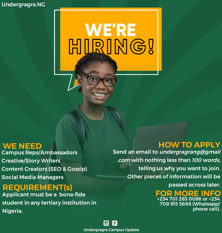 Undergraga Is Recruiting For the past 4 years we have delivered content,articles,gossips,stories e.t.c As Undergragra gets a year older, we …